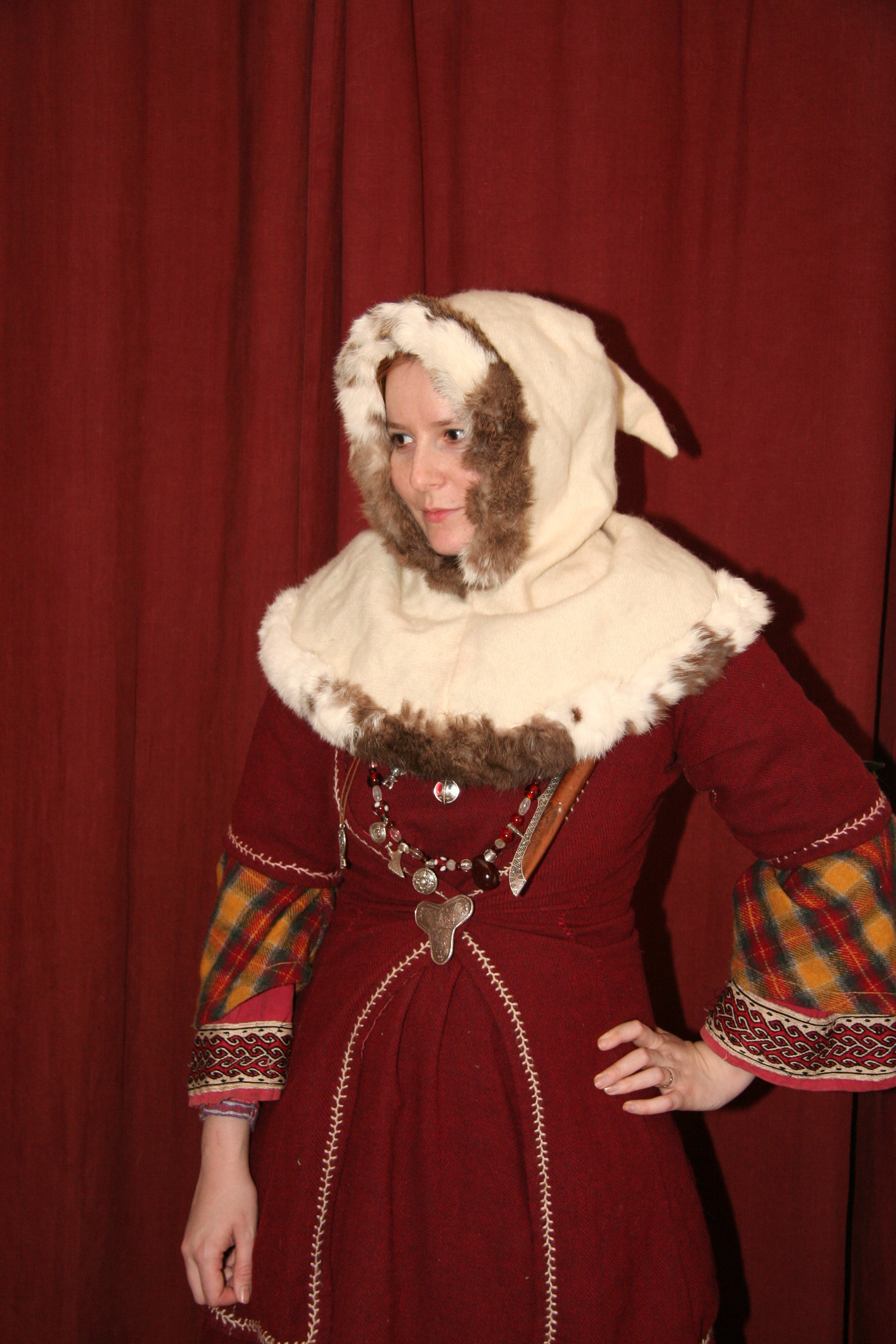 Ragnhild est un personnage noble (fille du roi du Leinster, et nièce du jarl des Orkneys), élevée aux Orkneys (forte influence scandinave). Toutes les coutures sont réalisées au fil de lin au point arrière. Les coutures apparentes sont réalisées au point de tige.