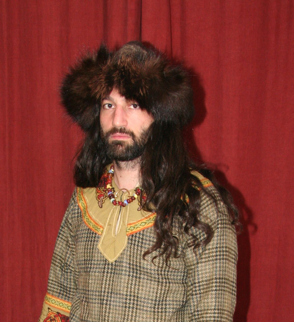 Chapeau en feutre, bordé de fourrure de renard. On a retrouvé des chapeaux ronds à Birka, mais pas exactement comme celui-là (en laine tissée et non en feutre, et sans fourrure au bord). Quelqu’un aurait-il une source ?