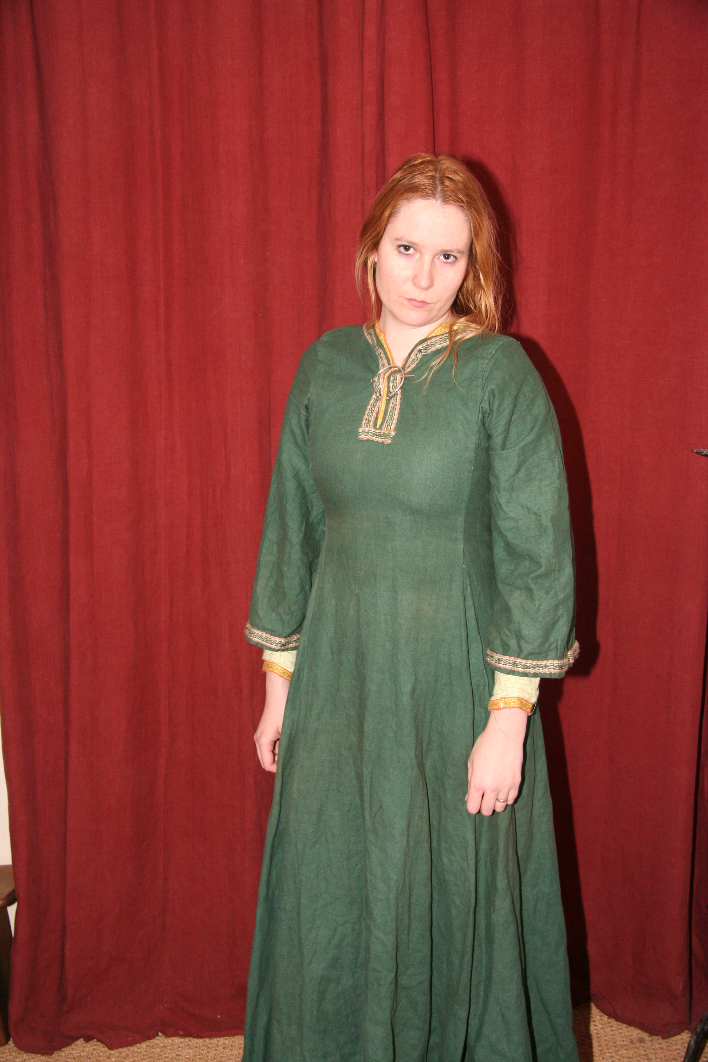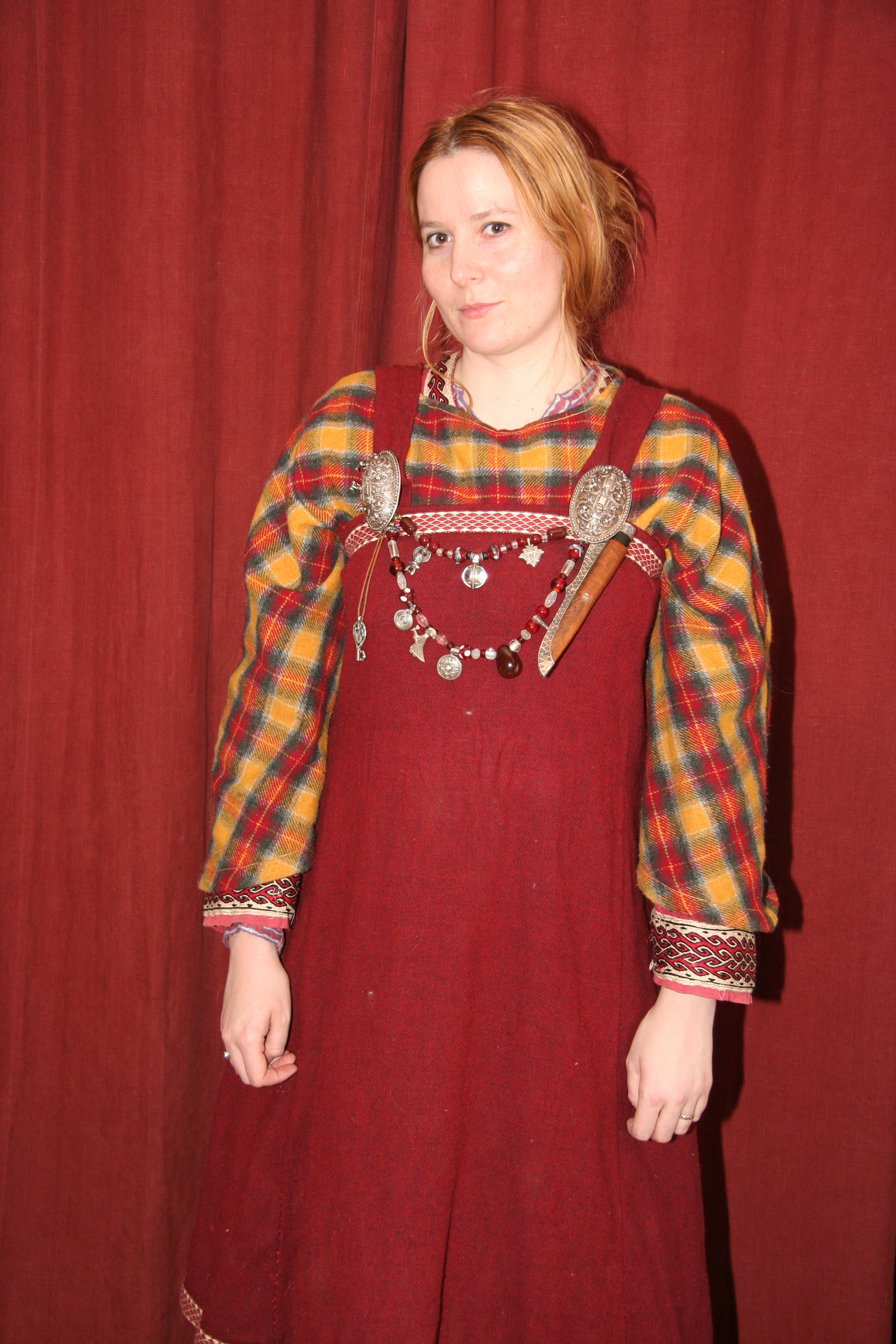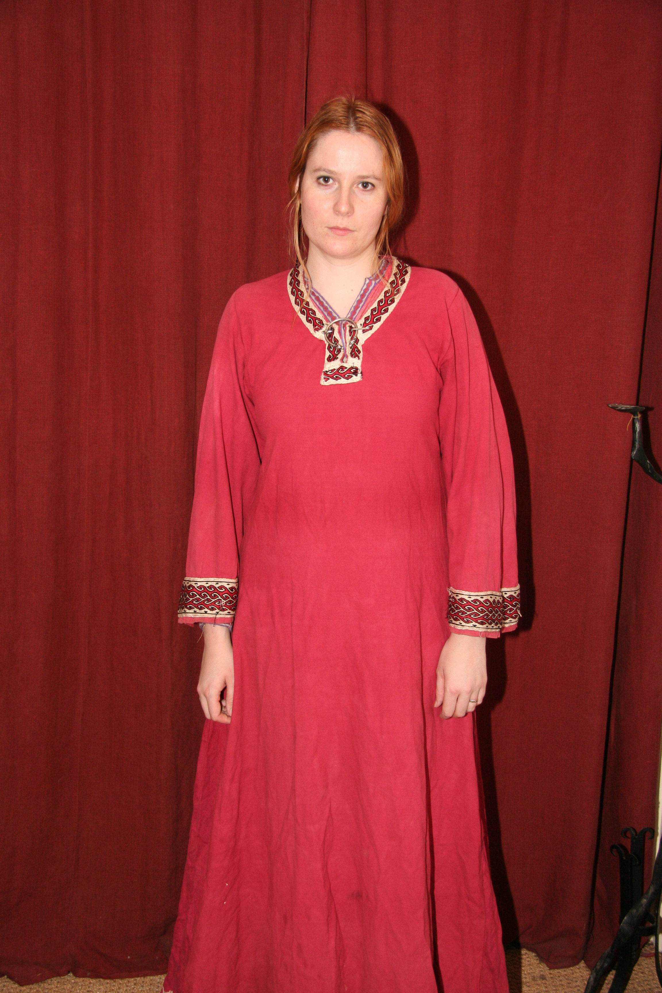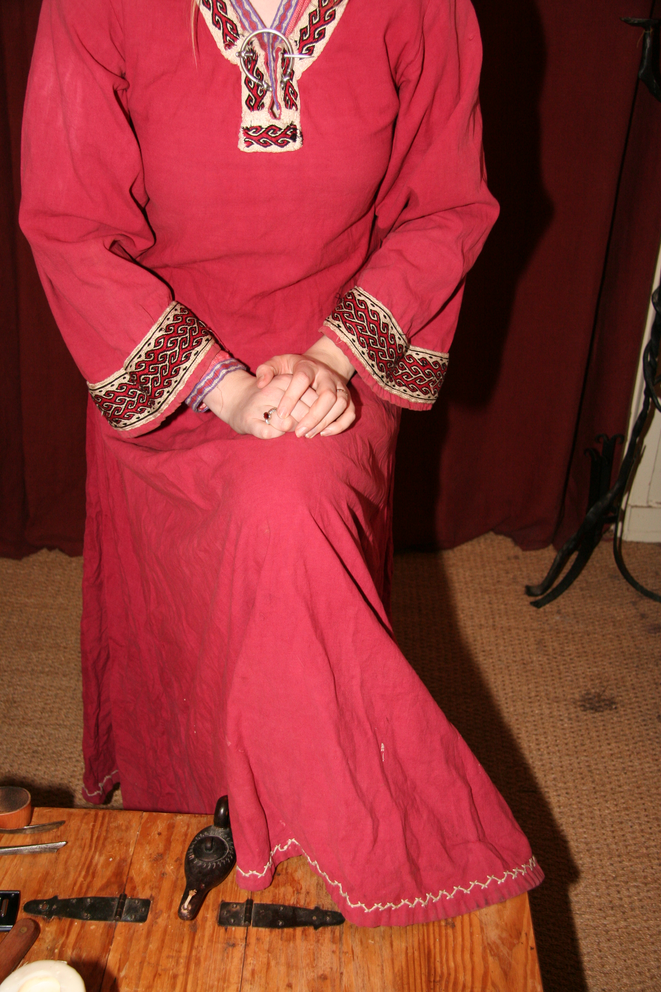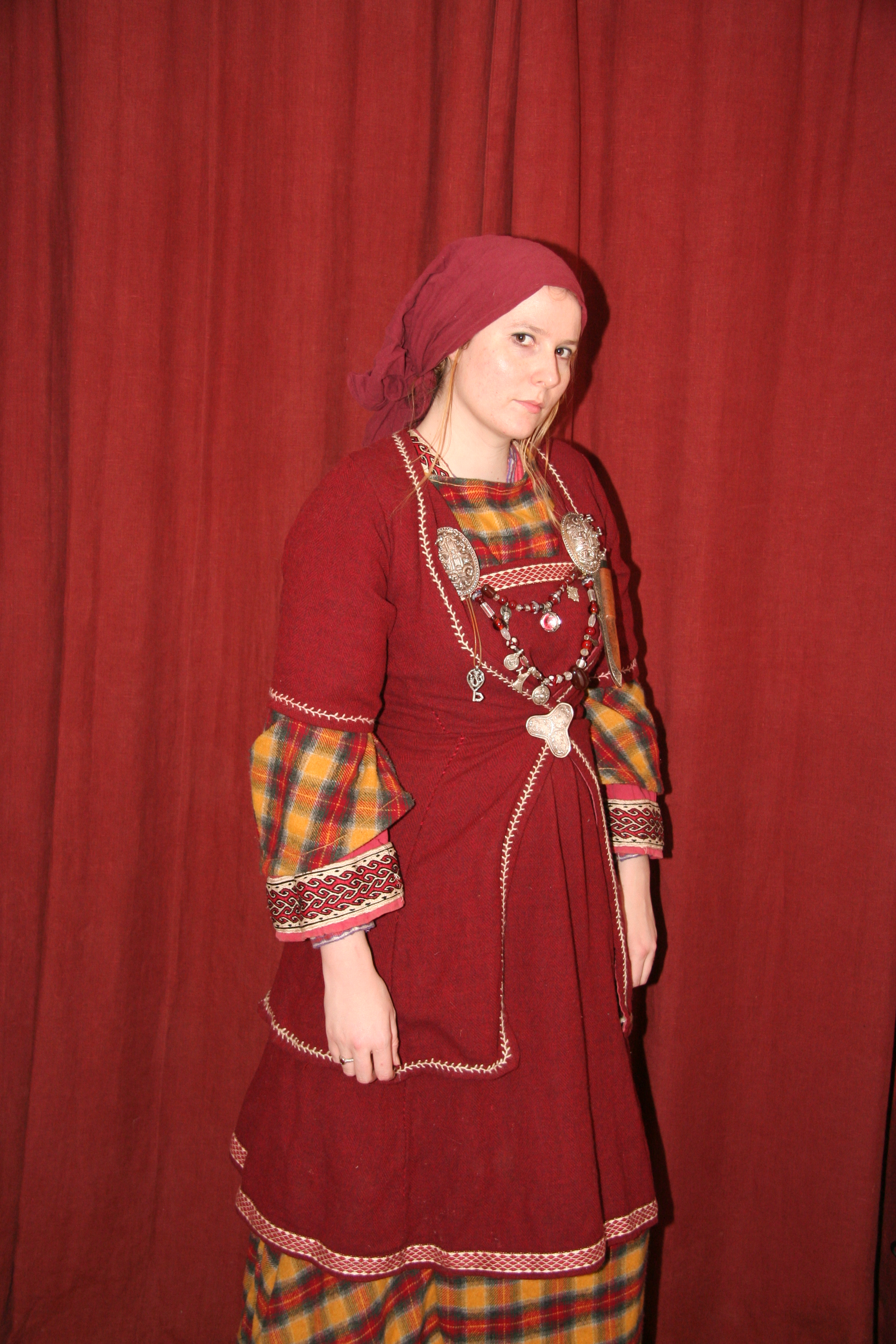 Ragnhild est un personnage noble (fille du roi du Leinster, et nièce du jarl des Orkneys), élevée aux Orkneys (forte influence scandinave). Toutes les coutures sont réalisées au fil de lin au point arrière. Les coutures apparentes sont réalisées au point de tige.