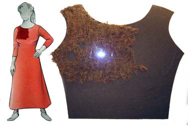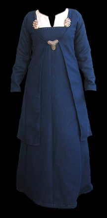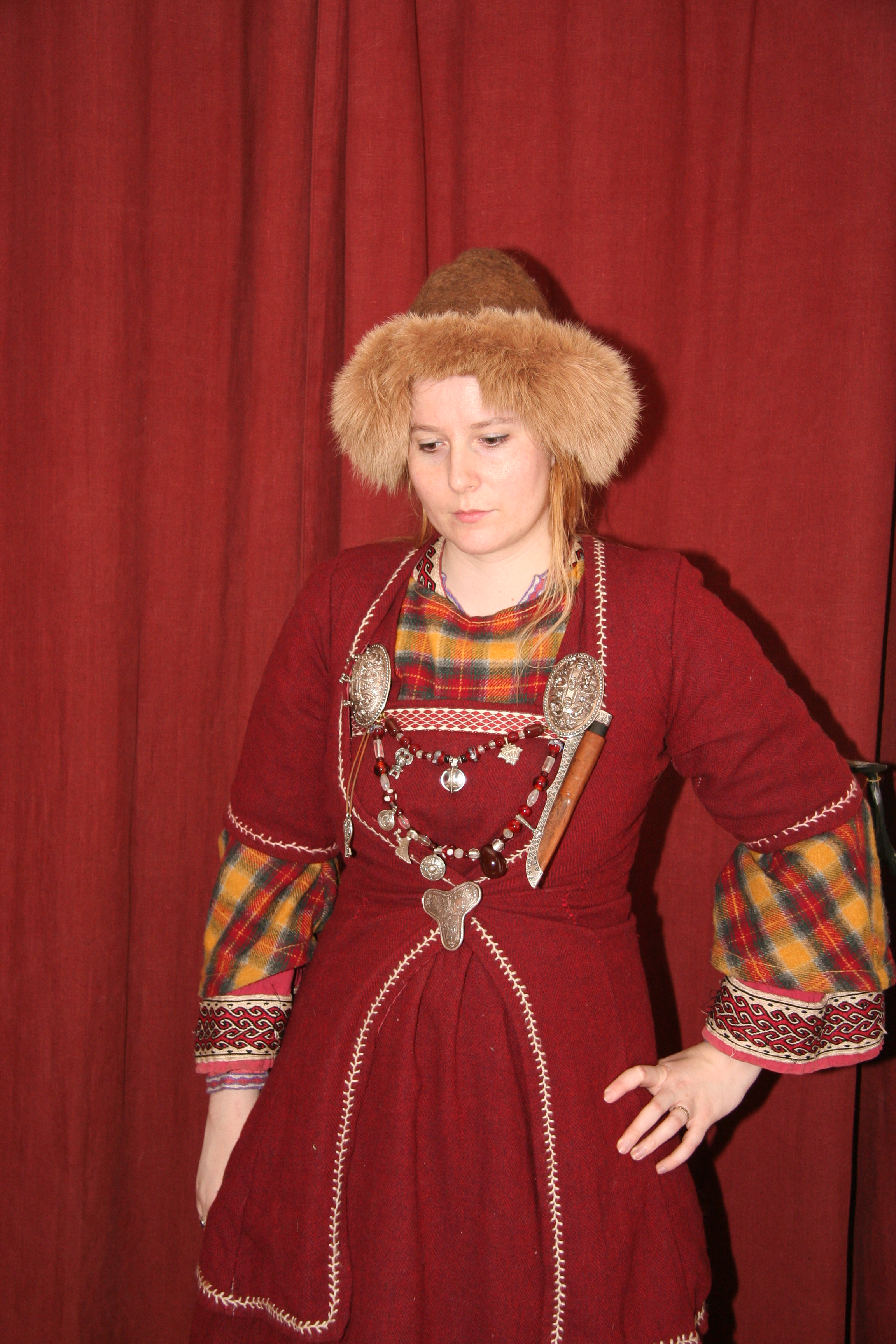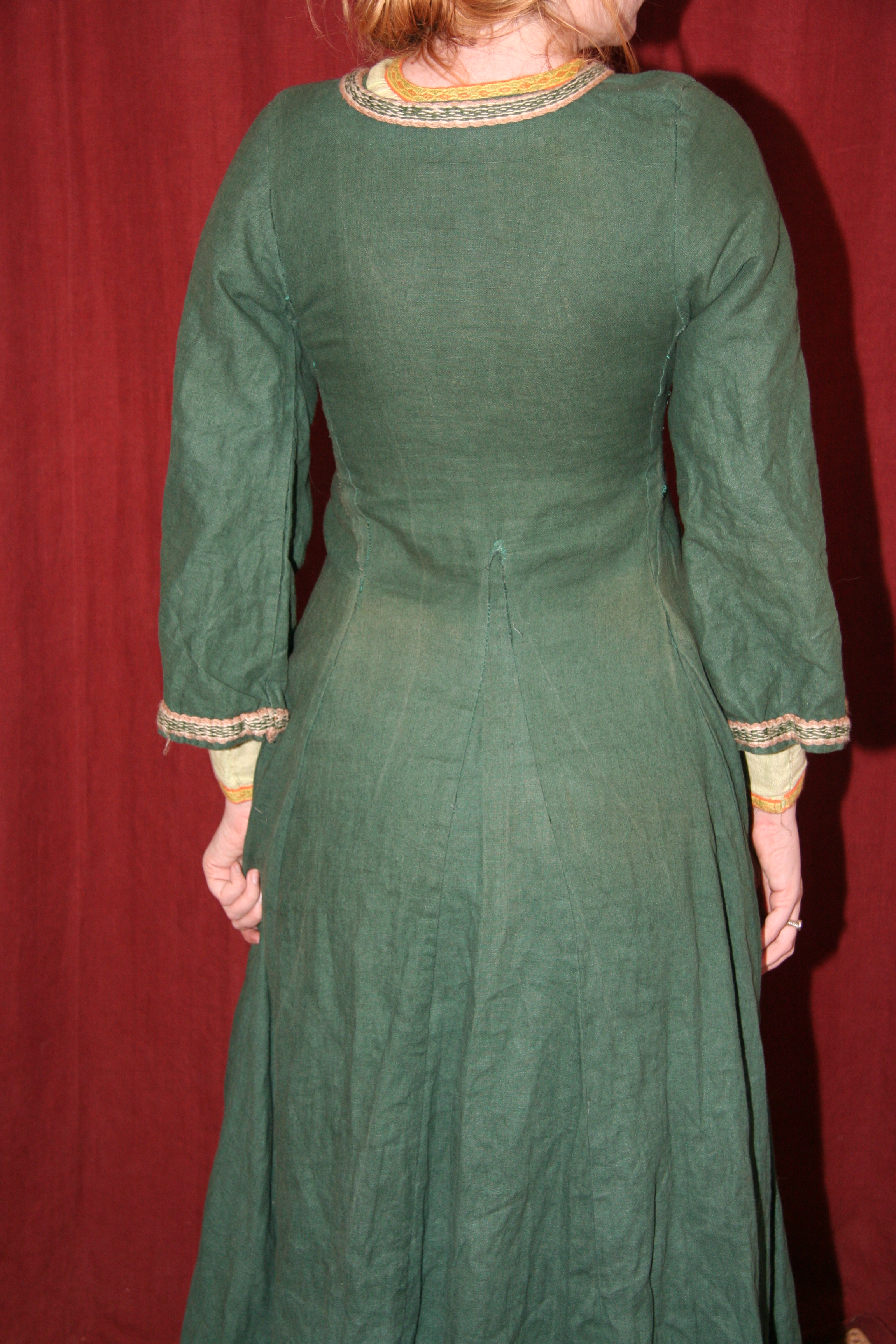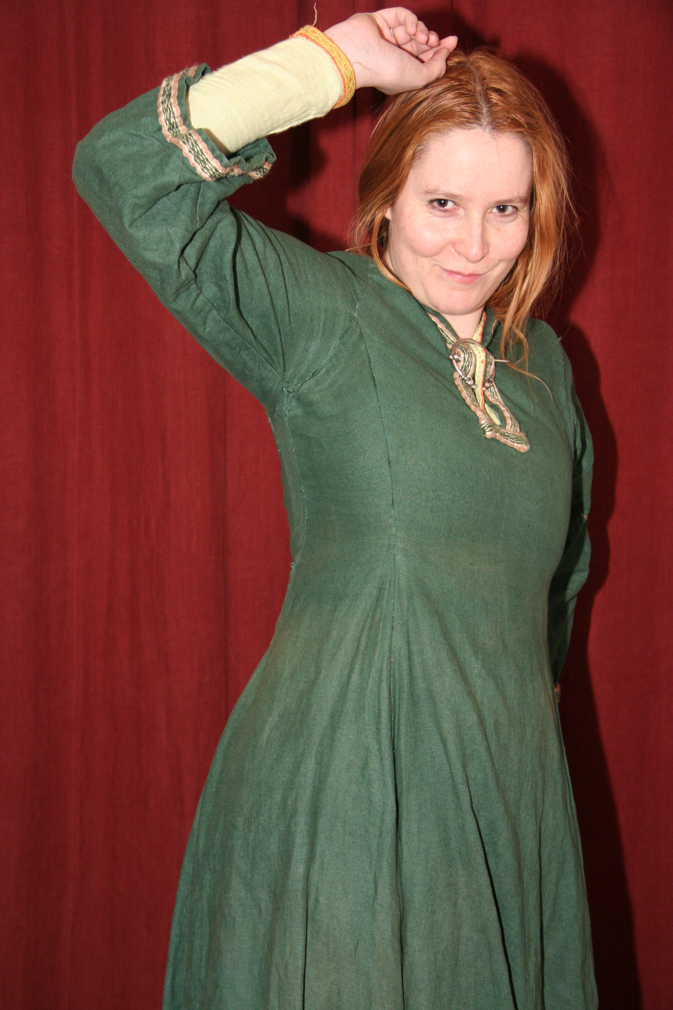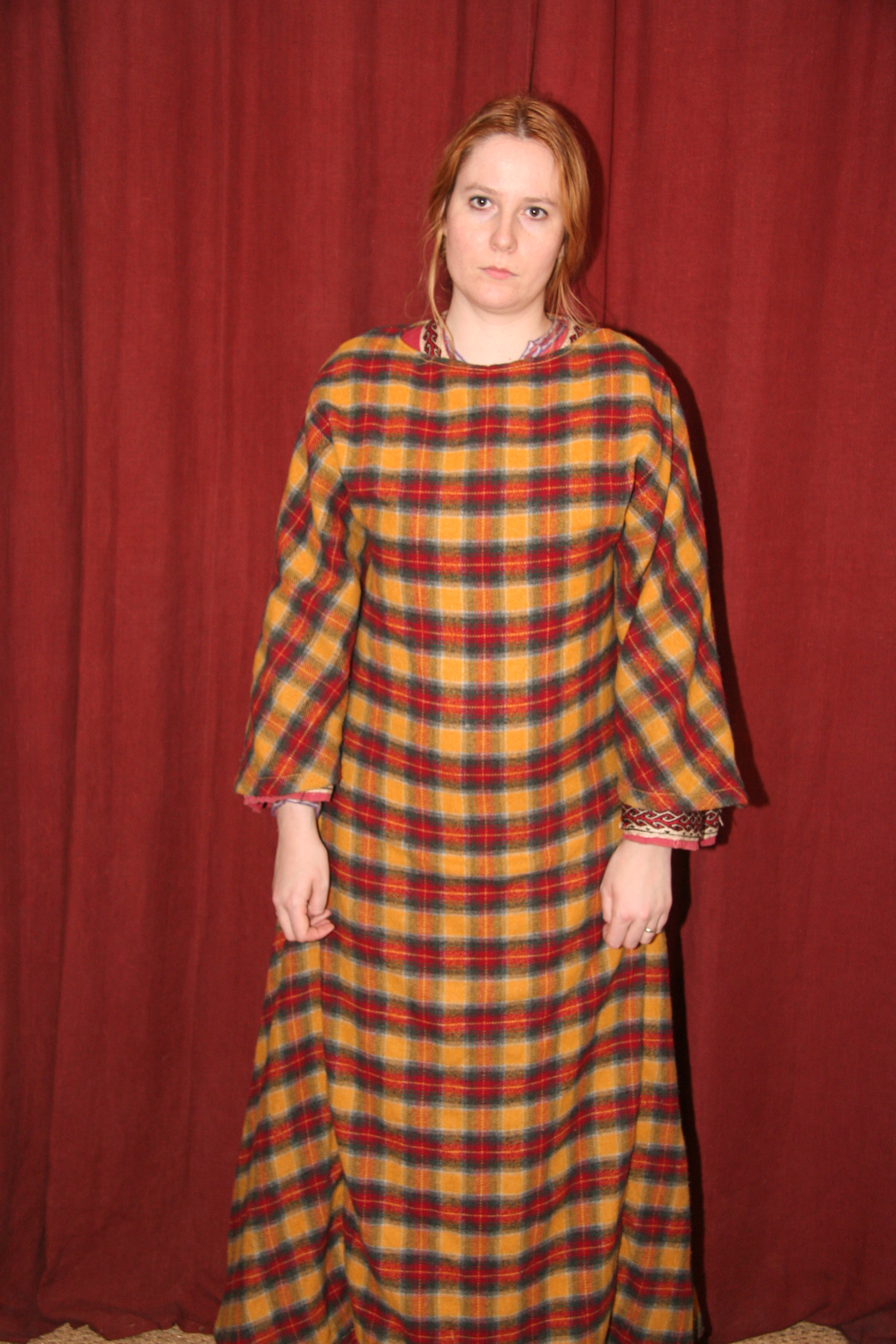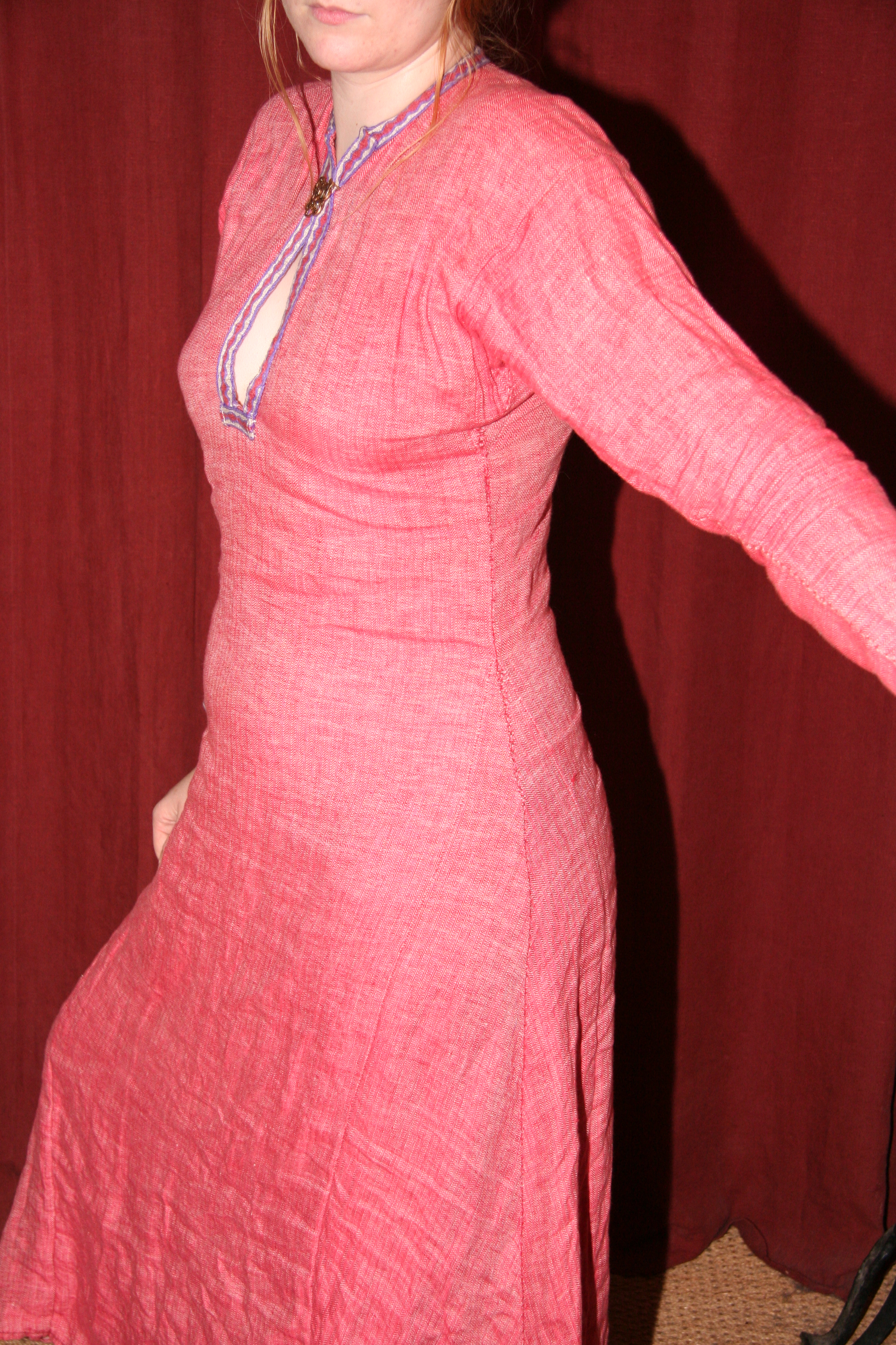 Ragnhild est un personnage noble (fille du roi du Leinster, et nièce du jarl des Orkneys), élevée aux Orkneys (forte influence scandinave). Toutes les coutures sont réalisées au fil de lin au point arrière. Les coutures apparentes sont réalisées au point de tige.