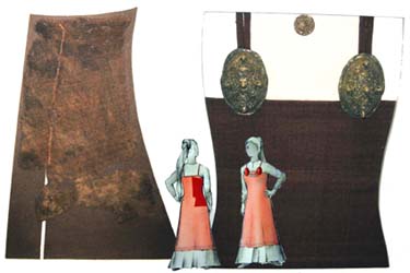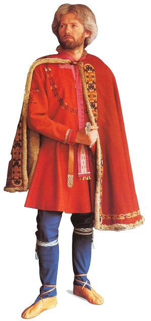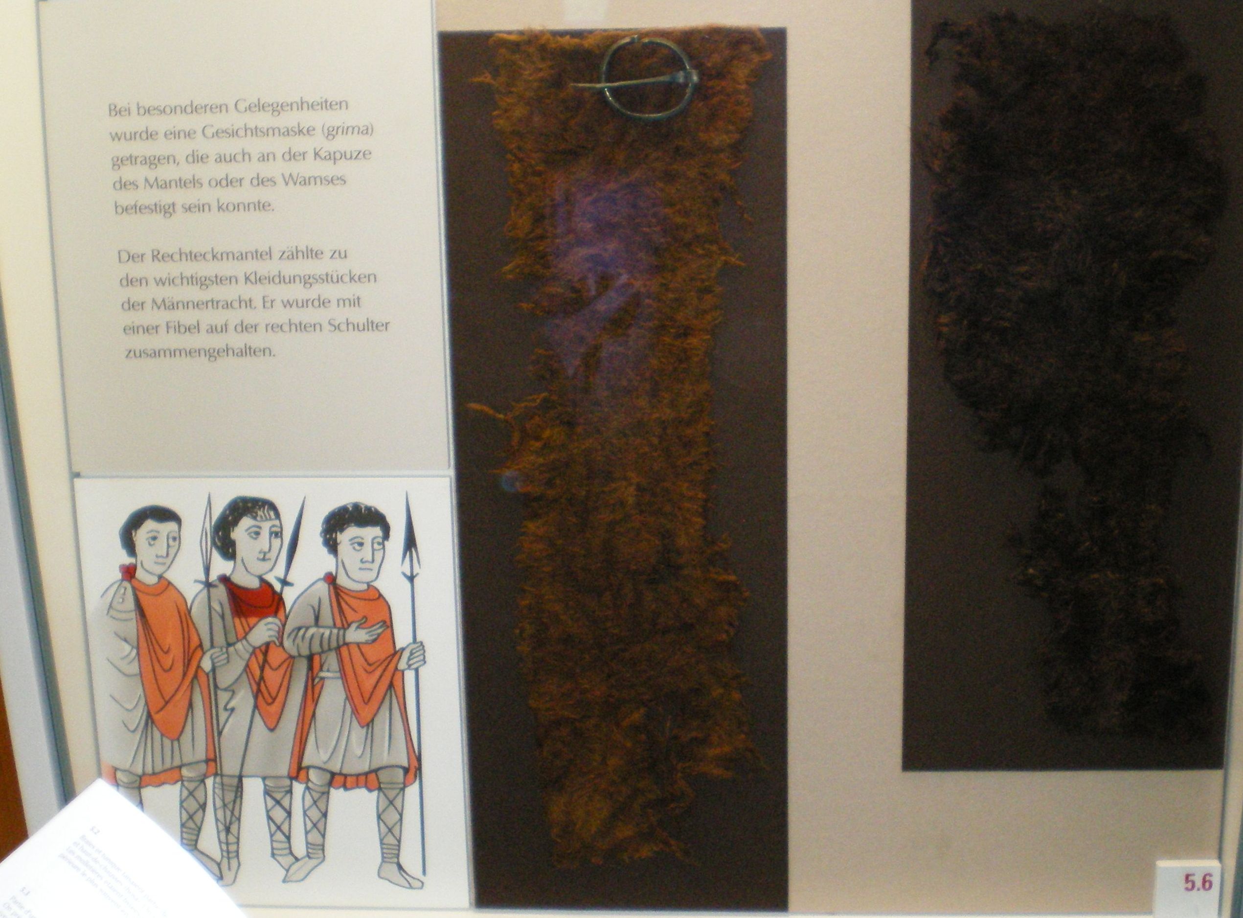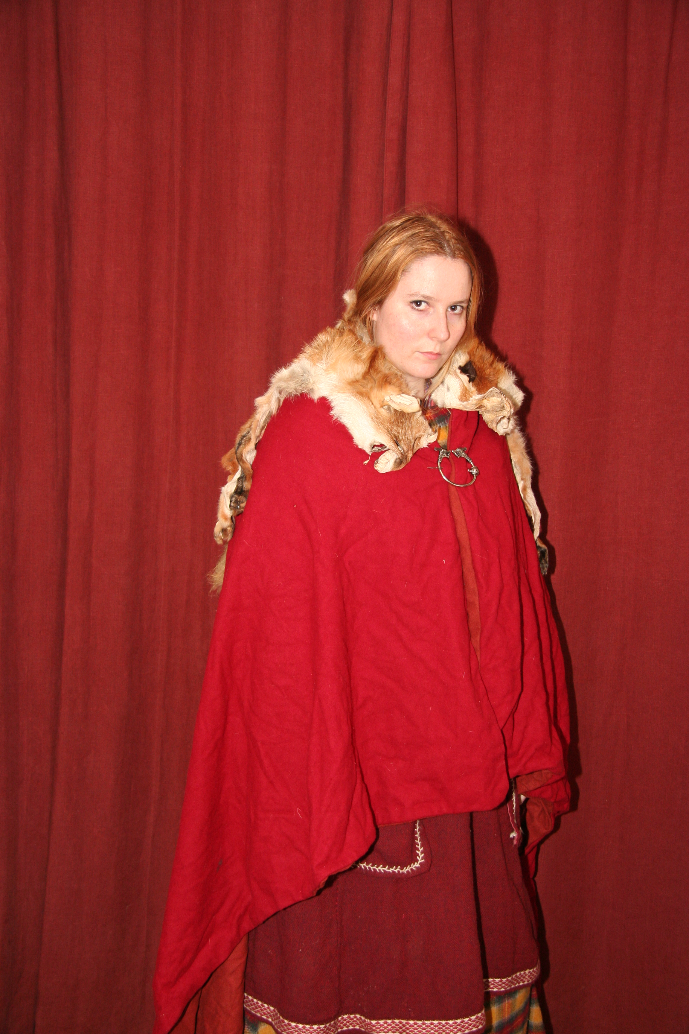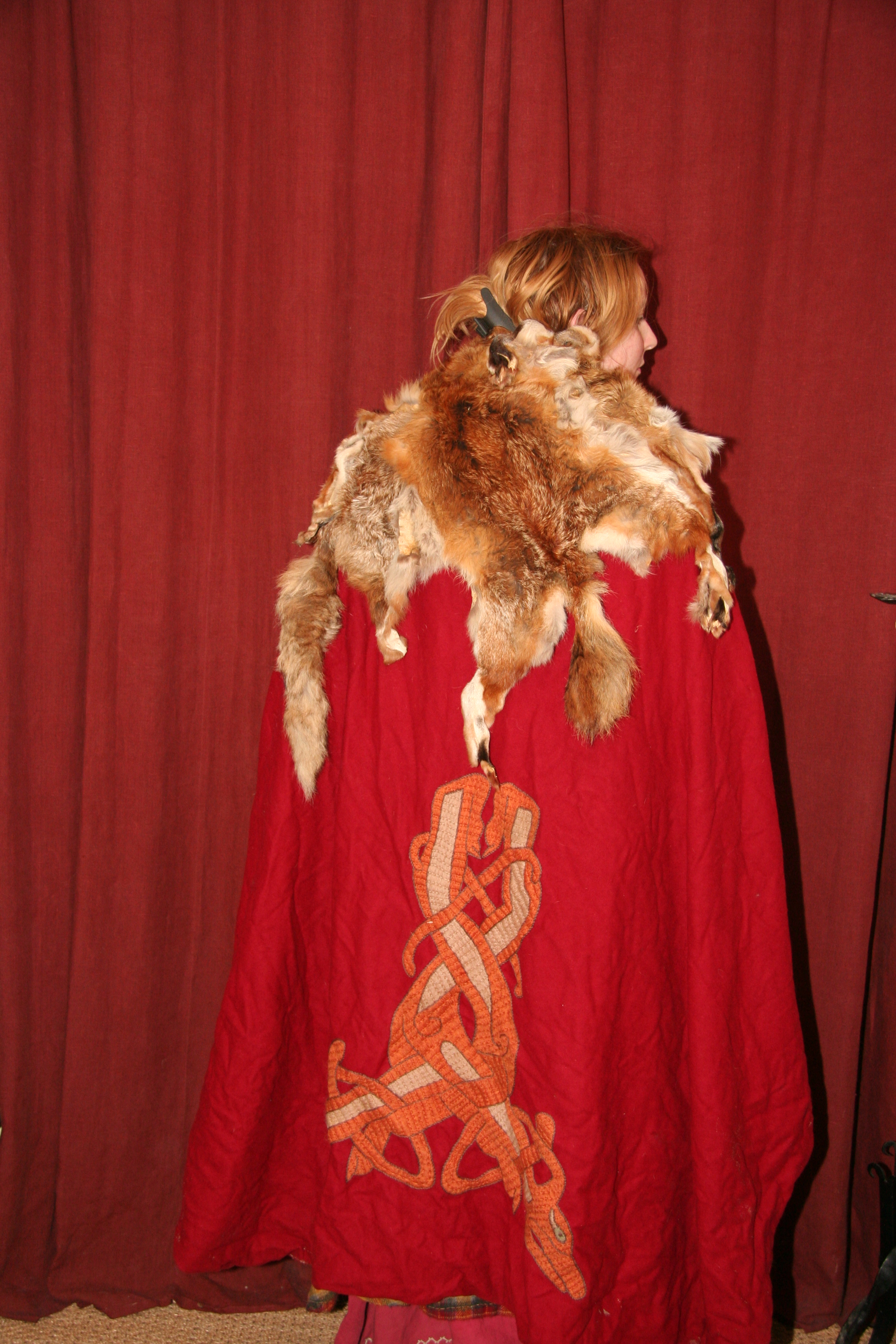 Cape en laineCape rectangulaire en laine rouge, doublée de laine orange. Les renards cousus en haut de la cape vont être retirés pour cause d’allergie et de non-historicité. La cape est brodée d’un entrelacs animal inspiré des entrelacs des îles britanniques.