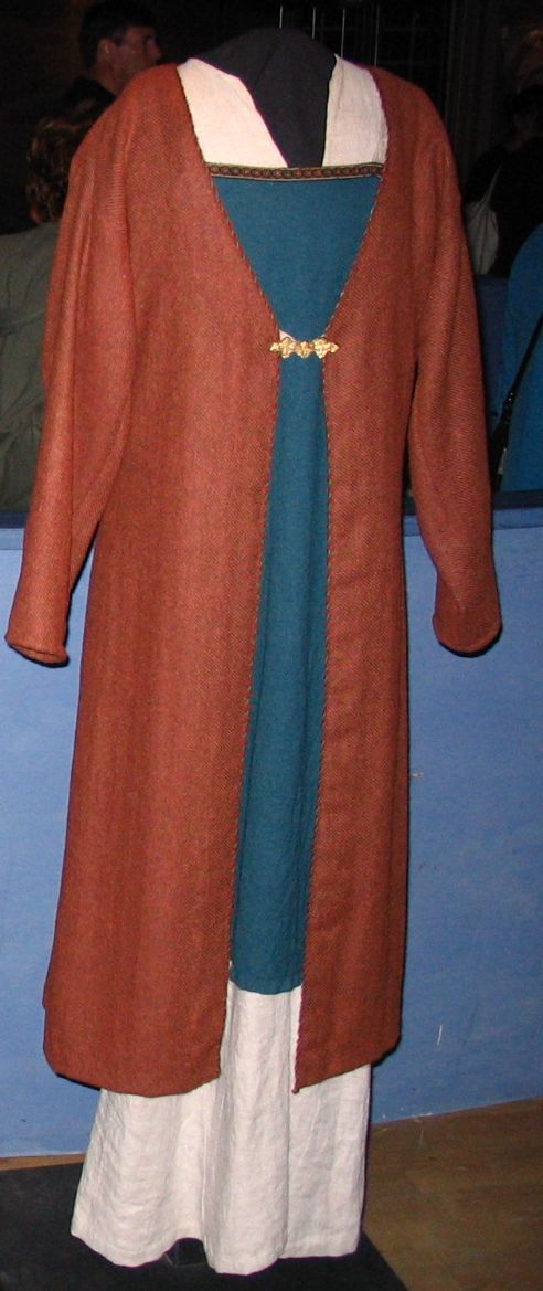 SurcottesSurcotte blancheSurcotte en lin blanc. Les manches sont rapportées et courtes pour permettre de voir celles de la robe en-dessous (mode continentale XIè siècle). Le col est rond avec un amigaut, et bordé d’un galon en soie (motif chien courant). Deux empiècements de chaque côté. L’arrière de la robe est taillé en pointe, pour rappeler certains pendentifs de Walkyrie.