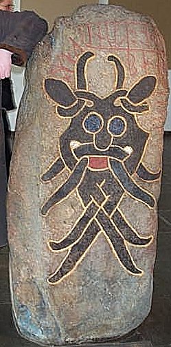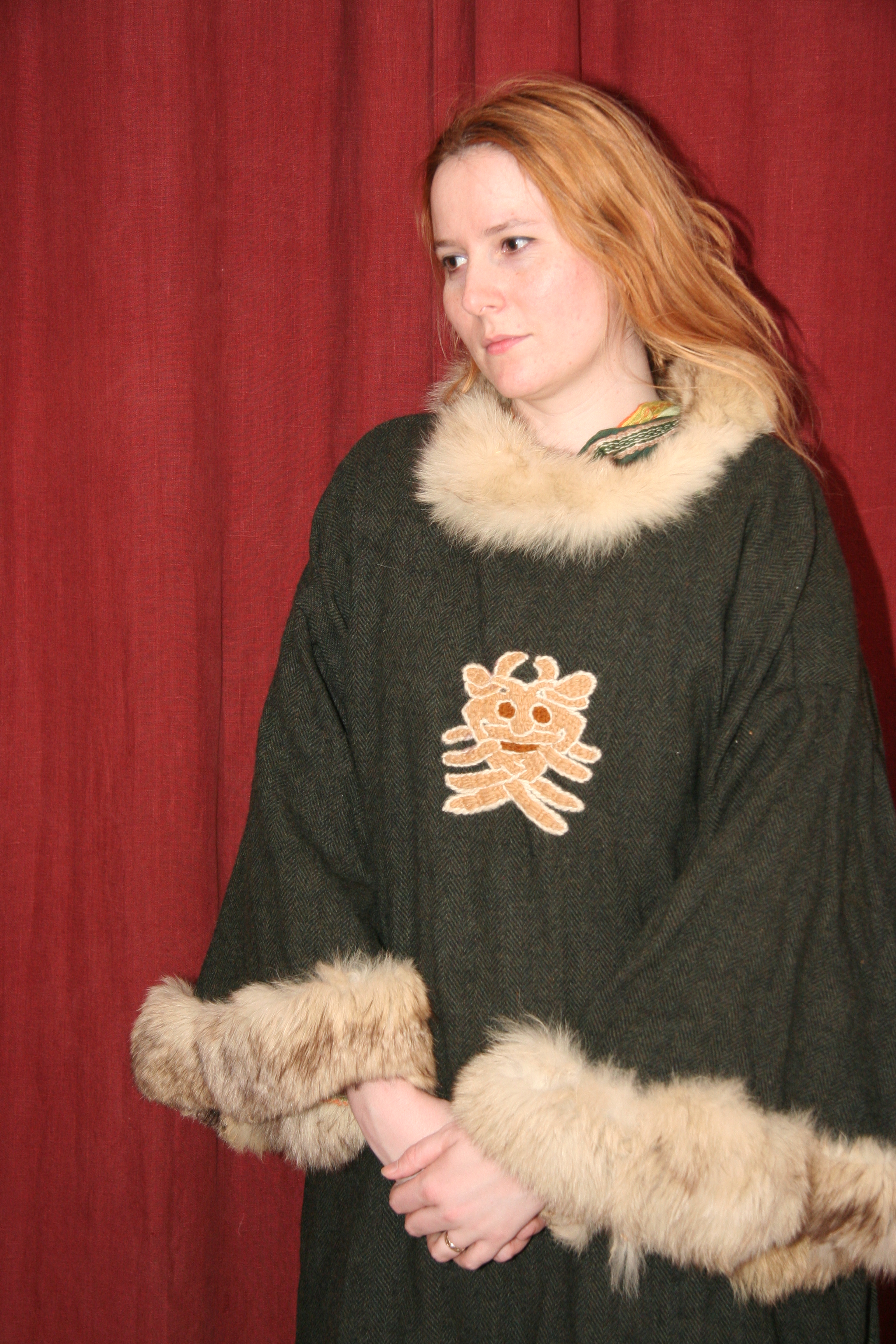 Surcotte verteSurcotte en laine verte. Deux empiècements (triangles) de chaque côté. Les manches sont rapportées et larges, telles qu’on peut en voir sur certaines pierres runiques. La robe est bordée de fourrure de loup et brodée d’un motif célèbre retrouvé sur une pierre runique (aarhus) et représentant possiblement Odhinn.