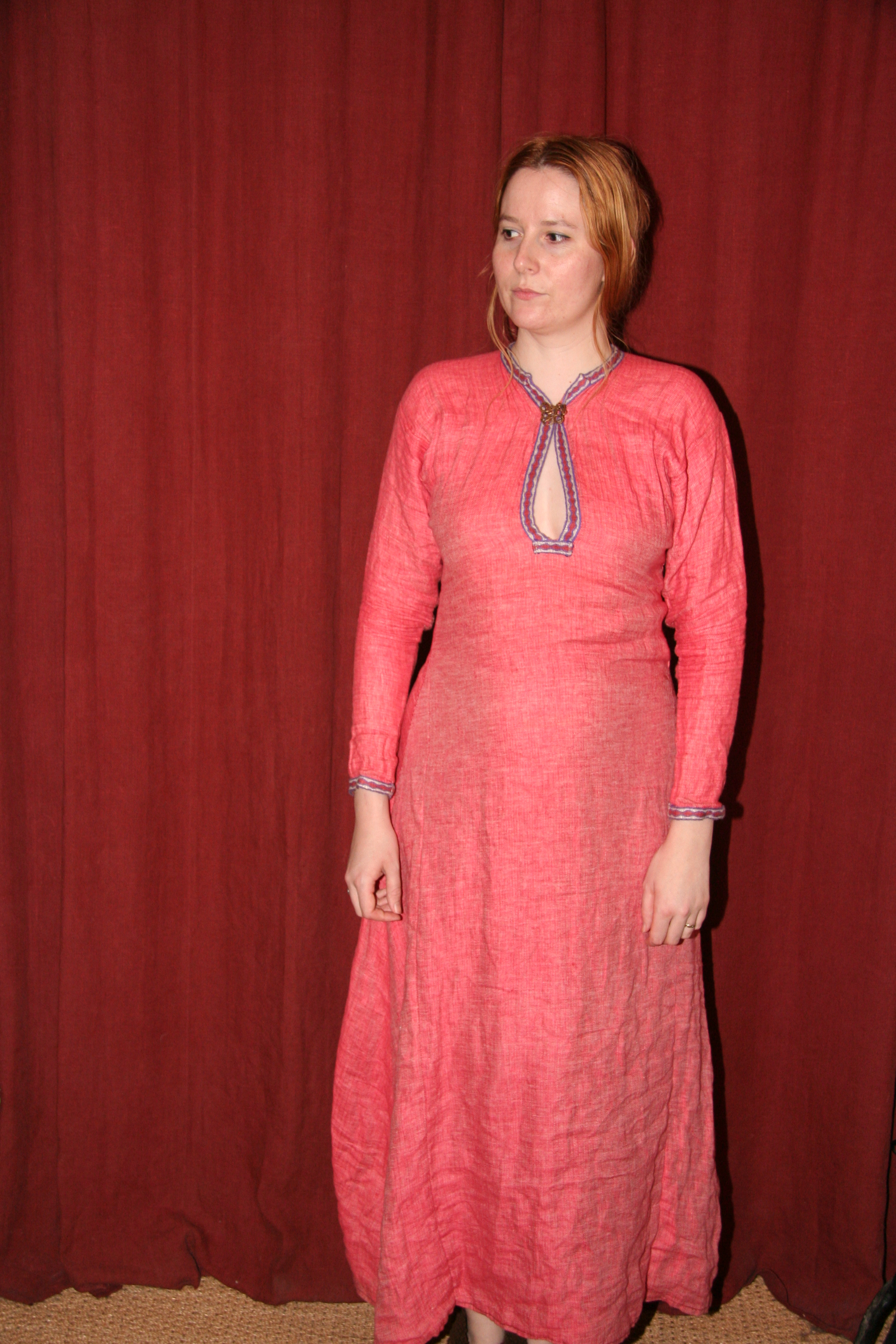 Chainse en lin rose, manches rapportées, col rond avec amigaut (profond pour permettre l’allaitement > non sourcé), deux empiècements (triangles) de chaque côté. Le col et les manches sont bordées de galon en lin (motif simple imaginé), comme sur la tunique de Skjoldehamn.