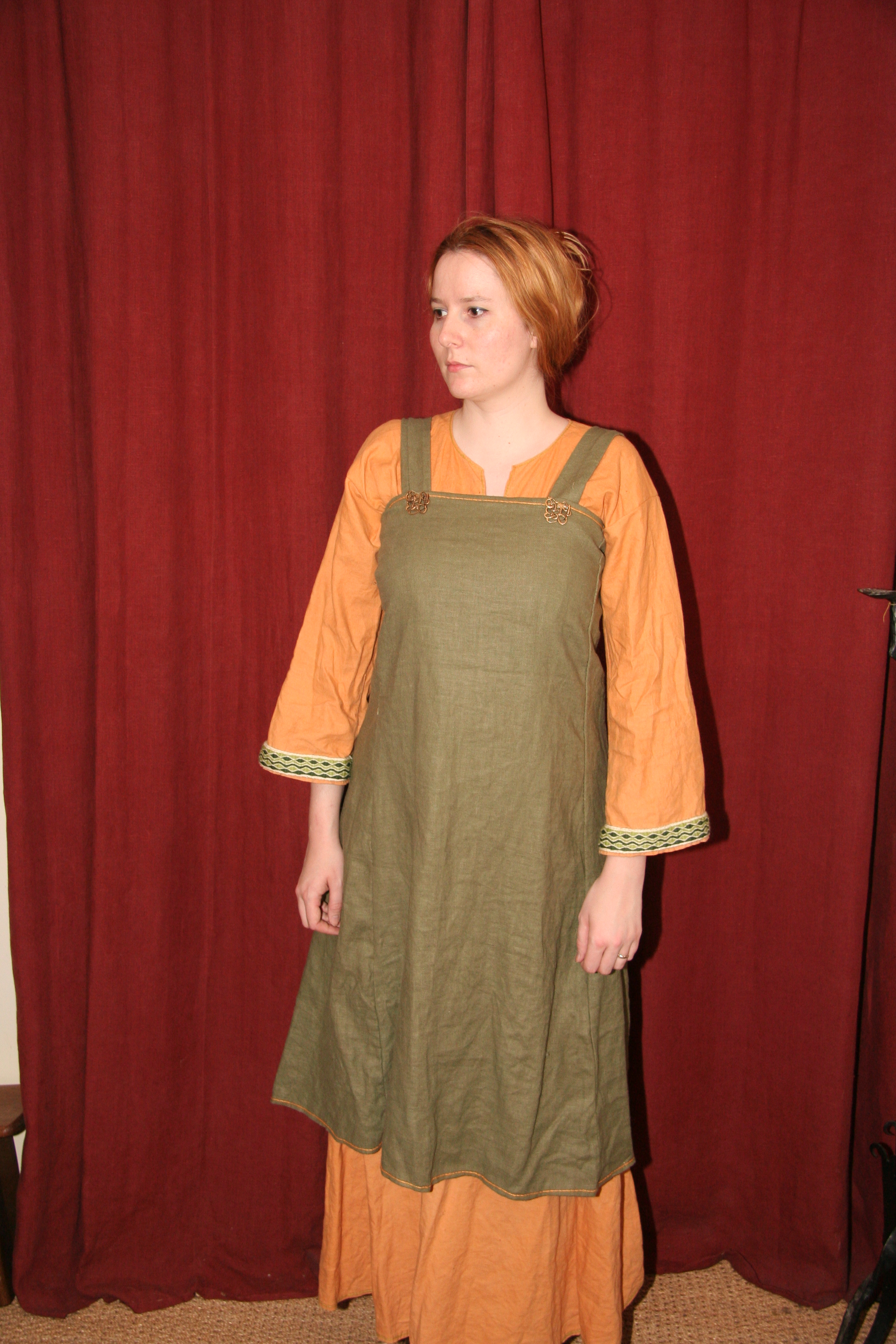 Robe en lin orangé, manches rapportées, col rond avec amigaut (profond pour permettre l’allaitement > non sourcé), deux empiècements (triangles) de chaque côté. Les manches sont bordées de galon en laine (motif simple imaginé), comme sur la tunique de Skjoldehamn.