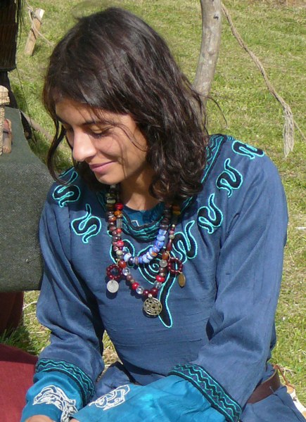 Alfgard ThorgilsdottirAlfgard est fille d'un artisan bronzier d'Haitabu. C'est dans l'atelier de son oncle perlier qu'elle apprend l'art de fondre des perles de verre; avec lui qu'elle voyage en Europe et en Orient pour acheter de la matière première et apprendre de nouvelles techniques d'élaboration des perles de verre.Alfgard est aujourd'hui avec ses associés à la tête d'un atelier de perles de verre de bonne réputation. Elle vit tantôt à Haitabu, Ribe, et dans d'importantes places commerciales d'Europe du Nord. Chaque année, elle passe de nombreux mois à voyager pour se procurer les matières nécéssaires et vendre ses produits..Alfgard porte un costume simple et pratique dénottant une certaine aisance sociale et des influences culturelles danoises et franques.Pour travailler elle porte une chainse de lin non teinté sur lequel elle peut revêtir une tunique longue de lin verte ou une robe de laine marron. Les décors de ses vêtements sont simples et soignés.Quand elle travaille, par dessus ses vêtements de toile, elle porte un tablier de cuir pour se protéger des projection de charbon et lui permettre de poser les piques brulantes sur ses genoux.Elle porte un manteau demi circulaire en laine de type franc attaché par une fibule.