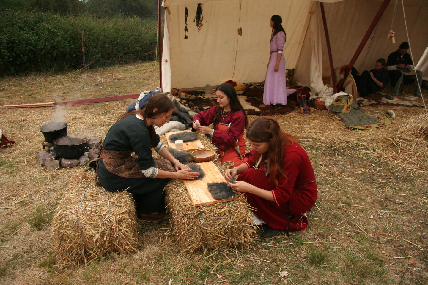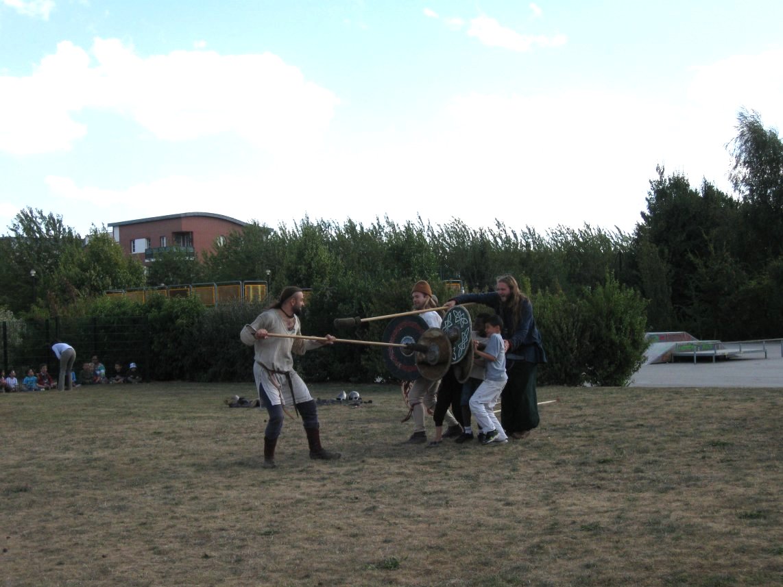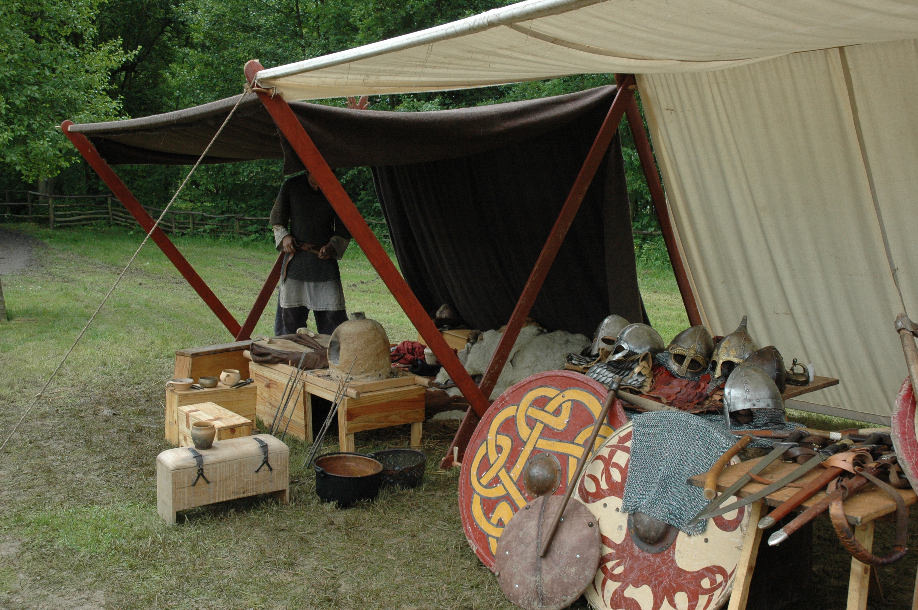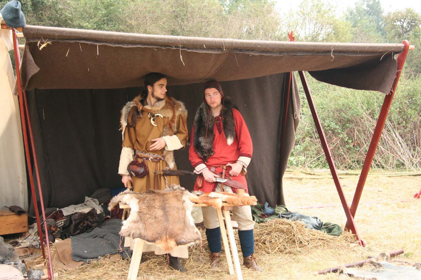 Camp privé Branche Rouge/Druzhina Hansa/Leita at BardagiDu 29/10/2009 au 01/11/2009 pour fêter les 10 ans de la Branche Rouge et la Samhain, au musée des temps barbares de Marle. Animation de l'île Saint Catherine - 18 et 19 septembre 2009La Branche Rouge anime l'île Saint Catherine à Tourville. Démonstrations d'artisanat et initiation du public. Spectacle de combat, contes, exposition sur l'hygiène et la vie quotidienne. Animation pédagogique dans un centre aéré à Guyancourt le 28 août 2009La Branche Rouge proposait le 28 août une animation d'une demi-journée sur le thème des vikings dans un centre aéré. Sept membres de l'association ont évoqué pour 80 enfants la période viking : au programme montage d'un mini campement dans le centre, contes et mythologie des anciens scandinaves démonstrations d'artisanat et initiation au tissage, au tannage et à des jeux viking, démonstration de combat. Atelier perle de verre à la Cidatelle de Namur, 23 et 24 août 2009L'atelier perle de verre de la Branche Rouge participe à l'animation de la Tour au Four de la Citadelle de Namur, sur le thème "les métiers du feu au moyen-âge". Expérimentation de construction d'une maison à 6 trous de poteaux en Bourgogne du 3 au 12 Juillet.La Branche Rouge expérimente une construction de maison à 6 trous de poteaux et toit à double pente : un modèle de maison que l'on pouvait retrouver en l'an mil en Puisaye. Les matériaux : 6 troncs de sapins coupés sur place, des roseaux récoltés dans un étang proche pour le chaume, de la paille, de la terre et de l'argile de Saint Amand. L'ensemble des matériaux provient des environs du lieu de construction. Les outils utilisés sont dans la mesures du possibles des outils d'époque reconstitués ou des outils à mains proches des outils utilisés en l'an mil: Pèles, pioches, brouette pour le terrassement; haches, doloires, herminettes pour fabriquer des poutres à partir des troncs; Scies à main, maillets ciseaux pour travailler le bois; Serpettes pour couper les roseaux du chaume; couteau ou hachette pour fabriquer des chevilles... quelques outils inventés plus tardivement (scies à deux personnes), le seul outils électrique utilisé à été une perceus(utilisée pour percer les trous pour cheviller). Nous étions entre 23 et 26 personnes durant 10 jours pour construire la maison. Des associations amies : Druzhina Hansa, les Forges de Midgard, Leita At Bardagi, sont venues nous aider sur l'ensemble du projet ou pour quelques jours. Débarquement Dreknorr à Paris, les 13 et 14 juin 2009La Branche Rouge accompagne le Dreknorr dans sa remontée de la seine qui se terminée à Paris au Parc Andrée Citroën. Débarquement Dreknorr à Vernon, les 6 et 7 juin 2009La Branche Rouge accompagne le Dreknoor dans sa remontée de la seine. Elle installe son campement sur les bords du fleuve à Vernon (Seine-Maritime) Atelier Perles de verre au musée de Velzeke, 30-31 mai 2009L'atelier de perles de verre de la Branche Rouge au musée de Velzeke en Belgique pour la cloture de leur exposition "Fragile" sur le verre à l'époque Gallo-Romaine. Pour ce week-end sur le thème du verre, le musée de Velzeke avait invité des soufleurs de verre anglais et français à travailler dans une reconstitution de four à verre antique construit par le musée pour l'occasion. Journées viking de Marles, 16 et 17 mai 2009Participation de la Branche Rouge aux journées viking de l'archéosite picard de Marle Grandeur Nature Historique "Les Larmes de Freydis", 3 et 4 et 5 avril 2009Organisé par La Branche Rouge et Leita at Bardagi, le grandeur Nature s'est déroulé sur un week-end à Lainsecq en Bourgogne. Il rassemblait 70 personnes de plusieurs compagnies de reconstitution (Branche Rouge, Leita, Druzhina Hansa, Les Renards, Frankheim Vikingar, Tantreval, ...) et des rôliste ayant fait l'effort de se faire un costume de qualité. Inspiré de la saga des Groenlandais et de la saga d'Eric le Rouge, le scénario se déroulait durant la dernière expédition au Vinland, celle conduite par Freydis Erikdottyr. |