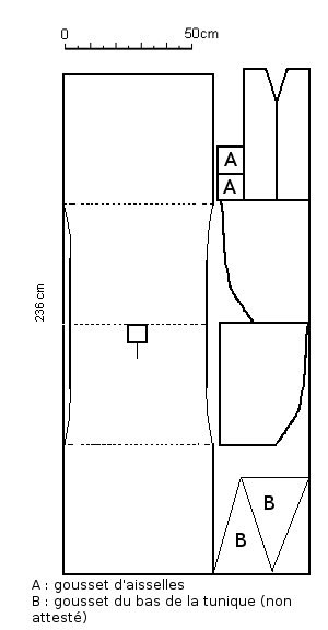 La meilleure source archéologique de tunique semble être la tunique du comte de Toulouse. Nous y découvrons des coutures et des pièces triangulaires qui pourraient correspondre à des goussets d'aisances au niveau des aisselles. Le bas de la tunique n'existe plus, nous ne pouvons donc pas savoir s'il y avait des triangles supplémentaires pour élargir le bas de la tunique.