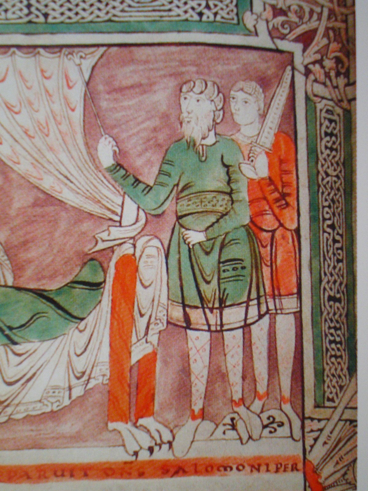 La tunique est le vêtement qui couvre le haut du corps, sur les enluminures elle est d'une longueur moyenne et s'arrête au dessus du genou. La partie haute de la tunique est assez proche du corps, notamment sur les avant bras. On peut remarquer au niveau des poignets et du col un double trait qui peut symboliser une couture, un galon ou un rajout de tissu. A la fin du XIe siècle, ce col aura une forme plus arrondi, pour notre période, il reste au contraire très carré. Dans les enluminures de Saint Vaast, le bas des tuniques est décoré par un galon ou une broderie rapportée. Le statut de la bande centrale de la tunique verte est plus délicat, ça peut être un galon ou une ceinture. C'est aussi le seul exemple que je connaisse pour cette période d'un galon au niveau du ventre.