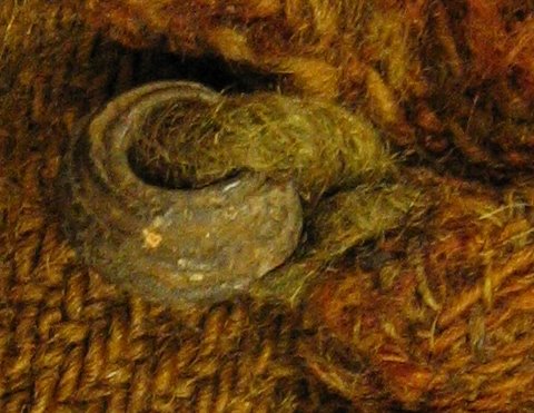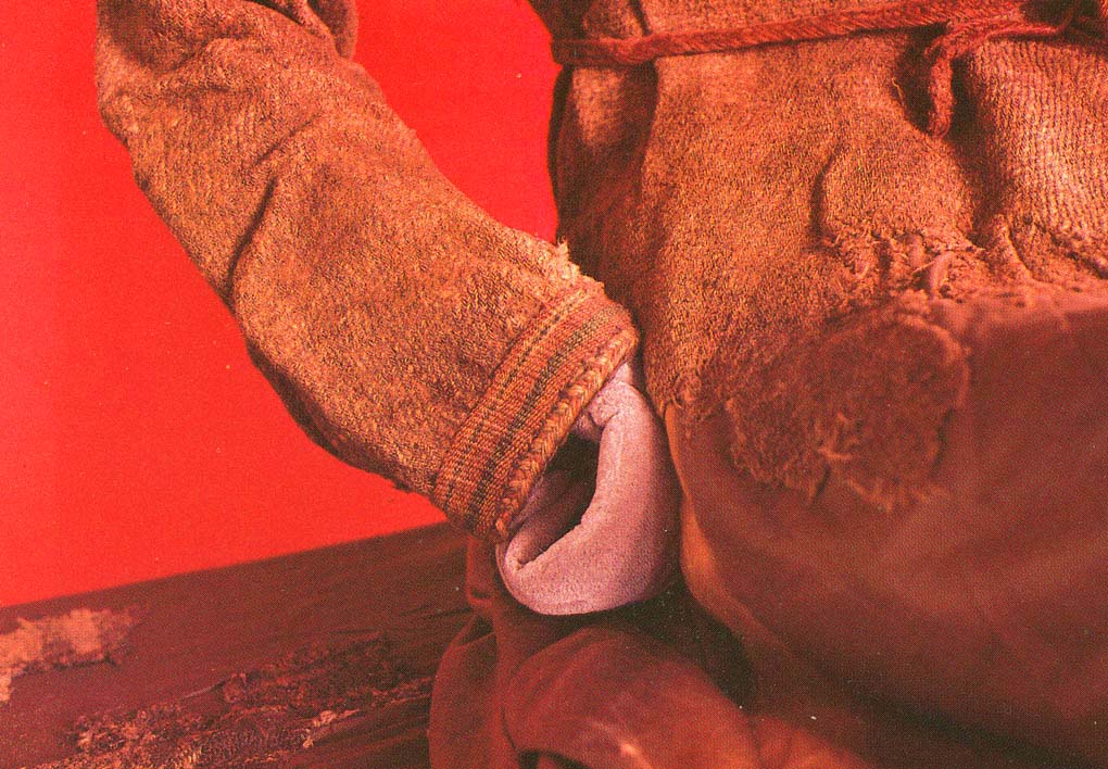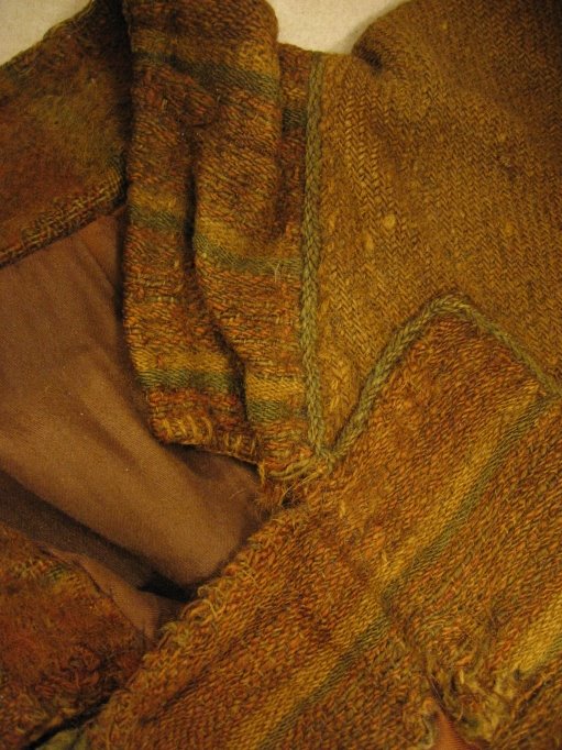 Cagouletype Nørlund type I à coupe simplifiée C'est une cagoule avec une pointe tombant dans le dos. Elle est faite de laine épaisse (partie spécifique de la toison, plus dense, grasse et imperméable) tissée en sergé. L'étude de la cagoule se révèle difficile car seul un coté et l'arrière sont conservés. Gutorm Gjessing a émis l'hypothèse qu'un cordon (retrouvé) était passé dans une rigole autour du visage, afin de pouvoir resserrer la fermeture. Deux trous à la base du menton sont bien visibles, mais la décomposition ne permet pas d'affirmer qu'il ne s'agit pas de trous d'usure. Sources