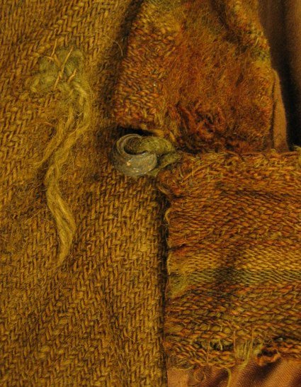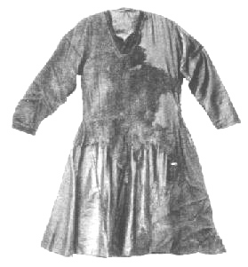 Le corps lui même a soulevé des questions. D'une taille modeste, 1m55, les études génétiques récentes démontrent que la personne, était une femme. Bien que le port de Skjold ait été à l'époque fréquenté par des scandinaves et des Saami (lapons), aucun marqueur génétique particulier ne permet d'étayer la théorie d'une appartenance à l'ethnie Saame (encore débattue aujourd'hui). Les premières datations basées sur une étude au pollen (Palynologie) et sur le style des vêtements situent la trouvaille au milieu du XIVe siècle. Une datation récente (1983) au cabone 14 a révélé que le corps a été enterré dans le marais au début du XIe siècle, soit entre 995 et 1029. Ces vêtements livrent d'importantes informations sur une région et une période mal connue du moyen-âge scandinave, à la fin de l'ère Viking. Sur-tuniqueLes données sur la sur-tunique sont trompeuses, a cause de la taille du porteur. Le vêtement devait arriver à mi mollet. La sur-tunique (ou Kirtle) est très ample, notamment au niveau de l'évasement de la jupe. Le col en V, ainsi que les manches sont bordés d'une tresse de laine (galon), faite au peigne. Les dimensions du vêtement sont les suivantes :