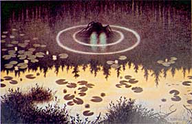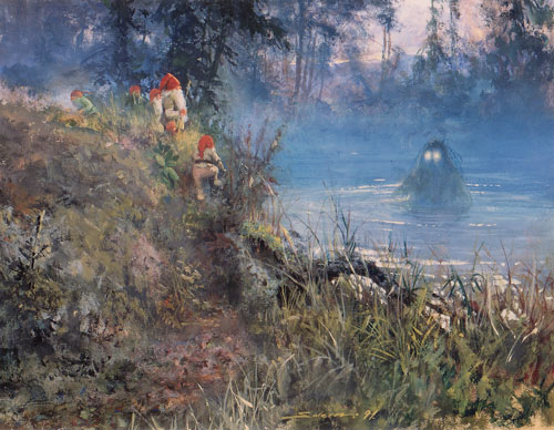 Cette description fait état d'un magnifique cheval blanc, gracieux, immaculé. Sa crinière et sa queue sont si longues et touffues qu'elles tombent jusqu'à ses sabots. C'est l'apparition d'un Näcken (en suédois) sous sa forme terrestre. Surpris sous cette forme, comme le dit le reste de la nouvelle, Näcken est de bon augure. Il offrira même sa protection à un humain, ainsi que celle de toutes les créatures de ses eaux. Ainsi, l'homme fait des pêches miraculeuses et se sent à son aise au bord du lac. Malgré tout, Näcken reste lié à l'élément liquide et à ses dangers. Loin d'être un esprit bienfaisant, il obtiendra finalement la vie de son protégé. Les variationsDu näcken au fulmarPourtant, dans les îles Lofoten, on retrouve un esprit marin en tout point similaire au Näcken. Le Havhest (cheval de mer) est issu de mirages dûts aux grandes chaleurs. Un point lumineux flottant se transforme en cheval blanc. Il est de bonne augure et chasse les mauvais esprits. Directement opposé aux horreurs de la mer, Havhest est séducteur et surtout aérien, puisque Havhest est aussi le nom norvégien d'un oiseau blanc, commun dans ces îles, le Fulmar. Peut-on y voir une symétrie : d'un coté le sombre cormoran de funeste augure, symbole de l'île de Røst et de l'autre, le fulmar, blanc et synonyme de bonne fortune ? La question reste ouverte. Les esprits de l'eau européensOn retrouve l'équivalent de Näcken dans d'autres mythologies, notamment la mythologie germanique, où il est appellé Nix. Chez les Finns, on le connait son le nom de Näkki (prononcez Nakki, avec un 'a' long). On le represente parfois sous la forme d'un affreux hybride, mi-homme mi-poisson qui peut se changer en une femme magnifique mais dotée de 3 seins. Dans la mythologie finnoise, le Näkki est, un peu à l'instar de Huldra, beau de face mais d'une extrème laideur de dos. Il a d'autres appellations, dont : Vetehinen ou Vesihiisi (gobelin d'eau). |